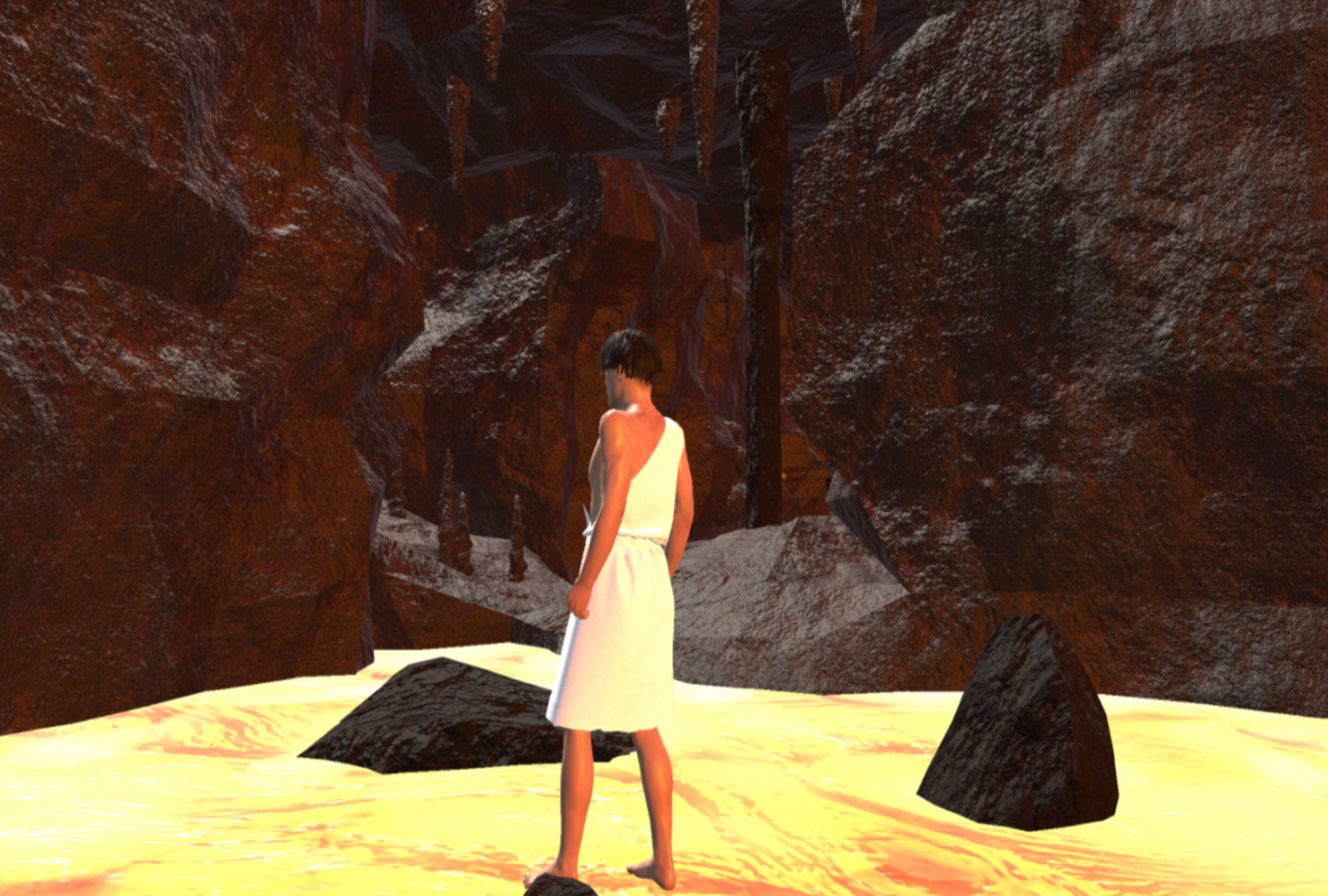 In the above images we find screenshots of the final 3D environment. Here we can see how the topographic map evolved into the 3D space and how the village goes into the sea and to the vulcano. Finally we get a snippet of the vulcano area where the little maze was.